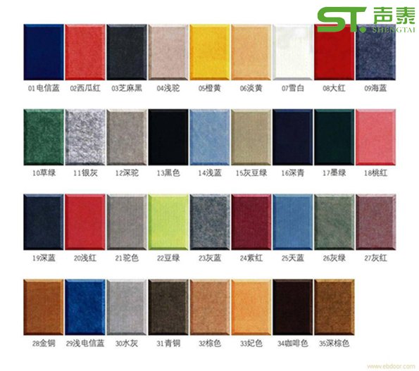 聚酯纤维装饰吸音板简称聚酯纤维吸音装饰艺术板。是一种以聚酯纤维为原料经热压成型制成的兼具吸音功能的装饰材料。主要用于室内天花吊顶与墙体装修,由于聚酯纤维吸音板的颜色种类比较多,因此成为很多工地墙体装饰吸音板的首选之一。下面是聚酯纤维吸音板色卡供大家参考