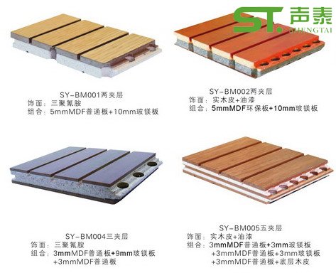 多层复合吸音板是根据声学原理采用防火B1、A2级基材精致加工而成,既有木装饰本身的装潢效果,又有良好的吸声性能。与其它吸声产品相比有独到之处,是当今国内外首选使用的中、高档室内装饰材料。材质及颜色根据客户需要,有樱桃木、沙比利、枫木、黑(红)胡桃、红白影、红白榉、麦哥利、泰柚等等,品种有开槽多孔型、D小眼孔型,组合型等多种样式可供选择。现在就让我们进一步的来了解什么是多层吸音板?多层复合吸音板又具有哪些特点?