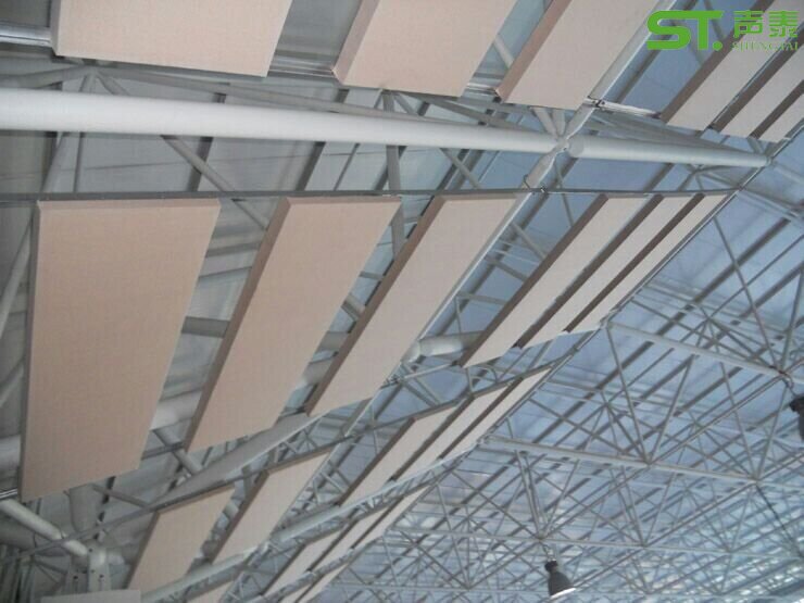空间吸声体大多悬挂于建筑物空间的顶部,且以离顶吊挂居多。板状空间吸声体可以水平分散吊挂,也可垂直分散吊挂,还可水平、垂直复合吊挂,在总面积相同情况下,降噪效果基本相同。水平悬挂板状空间吸声体的离顶高度一般为房间净高的1/5至1/7左右,一般来说,考虑到施工的难易程度,空间吸声体悬挂在建筑顶部的钢架以下,其高度刚好会在房间净高的1/5至1/7左右,达到吸声及装饰的要求;若条件允许,可挂得更低些,离声源近些。为了提高悬挂空间吸声体的建筑装修效果,应对空间吸声体的形式、色彩、悬挂方式等进行综合考虑。若使空间吸声体悬挂成一定的艺术图案,并与采光、照明、通风和建筑装修等互相配合,则整体效果更好。