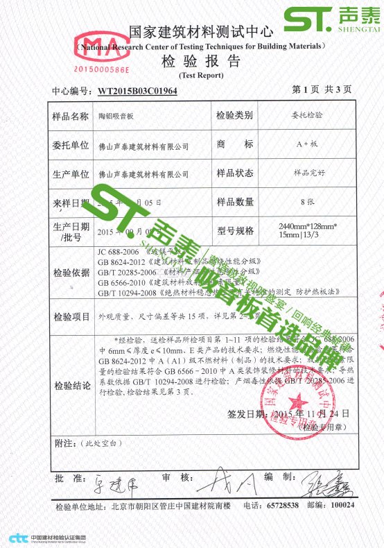 声泰陶铝复合穿孔吸音板广泛用于大型的会议场所、体育场馆、歌剧场馆、演播室、报告厅、多功能厅等建筑!该产品具有防火A2级难燃性能、环保E1级、吸音效果好、装饰效果杠杠滴!客户用了都叫好。最主要的一点就是也是很多工地要求提供的陶铝穿孔吸声板平整度的检测报告!以下附图是我司权威机构检测的平整度检测报告!目前我司跟万达所合作的【南昌瓷都剧院】【合肥万达剧院】所采用的均是我司出品的陶铝穿孔吸声板..